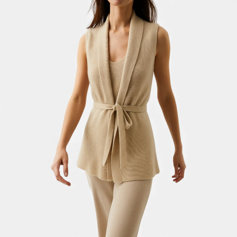 Diese Strickweste bietet eine weiche Struktur und eine feminine Silhouette, die sich mühelos in verschiedene Outfits integrieren lässt. Der breite Kragen und der Bindegürtel sorgen für eine harmonische Form, während das offene Design Bewegungsfreiheit und vielseitige Kombinationsmöglichkeiten schafft. Ideal für entspannte Tage oder stilvolle Alltagslooks.