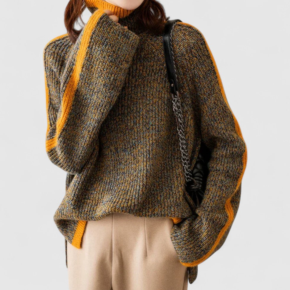 Dieser Strickpullover kombiniert Komfort mit einem modernen, entspannten Look. Das grob gestrickte Material sorgt für ein warmes Tragegefühl, während der weite Schnitt und die markanten Kontraststreifen an Ärmeln und Kragen einen modischen Akzent setzen. Ideal für herbstliche Spaziergänge oder gemütliche Tage zu Hause.